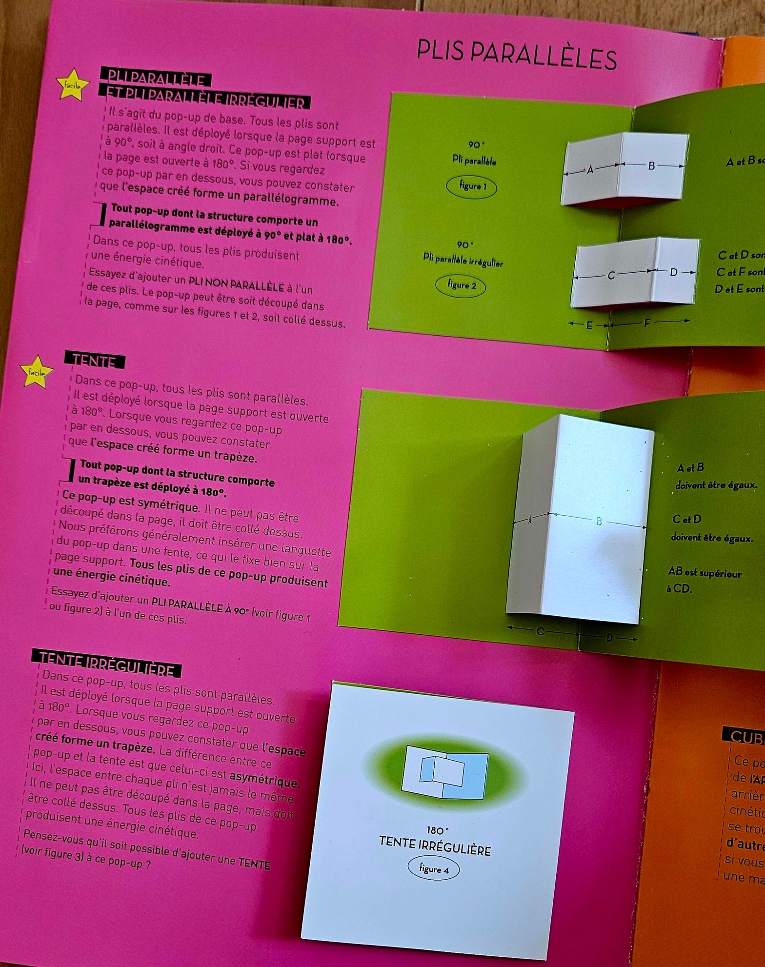 Plateforme (box fold) : C’est une petite scène ou structure qui s’élève de manière tridimensionnelle : un stade, une maison, ou une surface plane sur laquelle on peut coller plusieurs éléments. Le papier est découpé et plié de façon à former une forme en 3D fermée (comme une petite boîte ou un cube) quand on ouvre la page. Ça crée un objet qui “sort” du livre avec du volume réel : une maison, un coffre, une table, un gâteau…